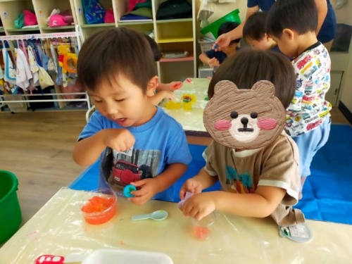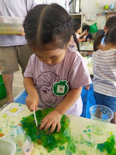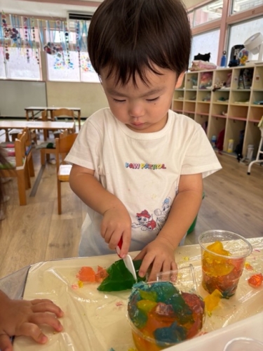 寒天の感触だけでなく、使っている道具の面白さに気が付いて、それを楽しんでいる姿もありました♪