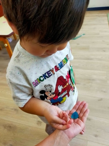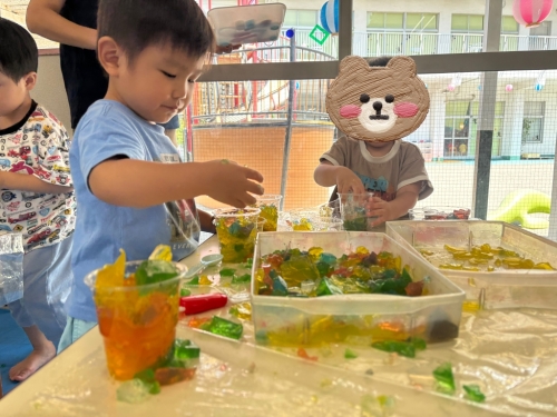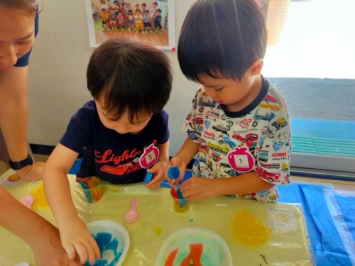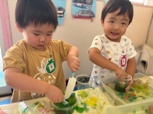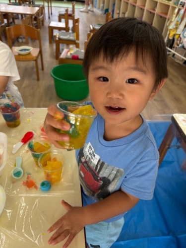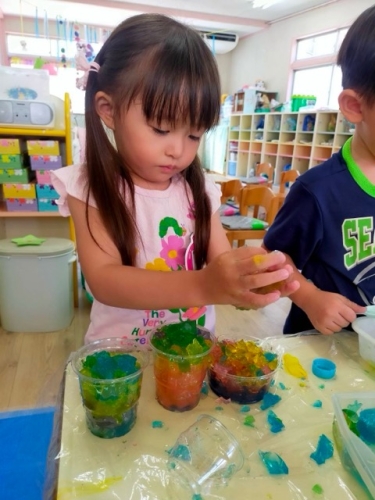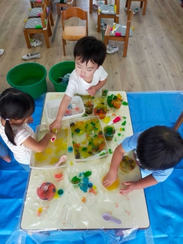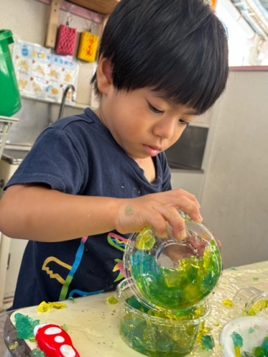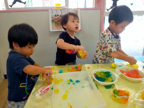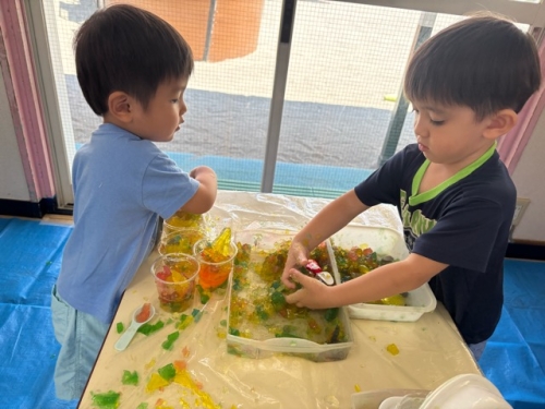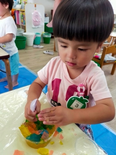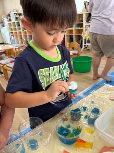 手や道具を使って細かくした寒天をたくさんカップにつめたり、色が混ざって変化に気が付き喜んだり、想定した以上に集中して遊んでいたプレクラスのお友達😍