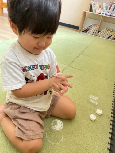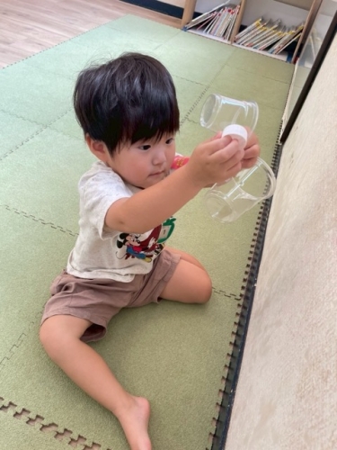 道具を使ってカップの中に入れてみたり、手で触ってみたり