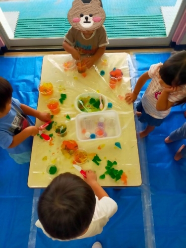 今日は、本来だと用意していただいた水遊びセットに着替えて、水遊びを楽しみたいところでしたが、やはり屋外での活動は熱中症の心配があるので、室内で寒天あそびをしました♪