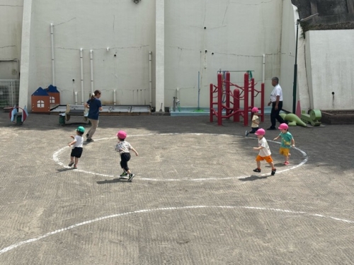 ↑これだけ先日の写真になりますが…園庭に円があるのを見つけて走っていた様子😊