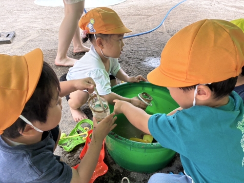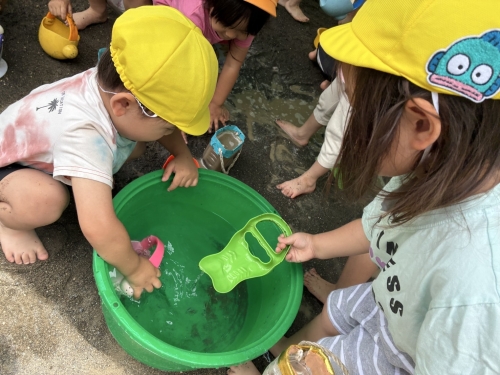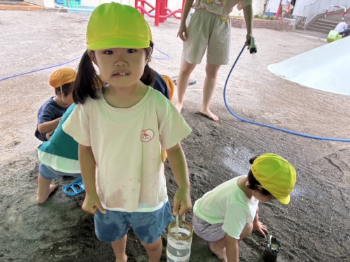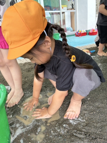 ジョウロやシャベルを使い、地面を濡らしたり、友達の足に掛けてあげて楽しむ姿もありました![]()