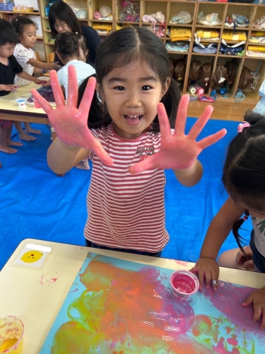 「青と赤混ぜたら紫になった!」「赤と黄色でオレンジ!」と発見がたくさん♪