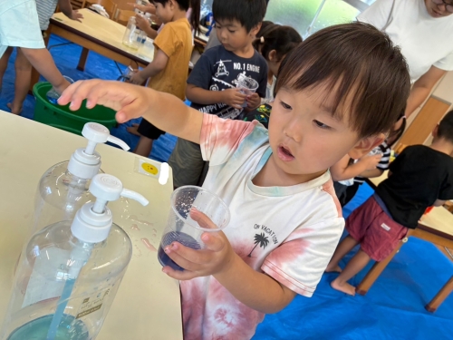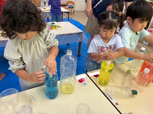 ひよこ組の子ども達もコップに好きな色を混ぜて、「こんな色出来た!」と見せてくれました。