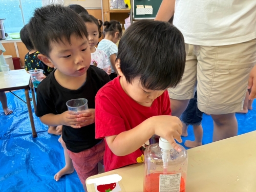 さて、今日は年少組で色水&氷遊びをしました。