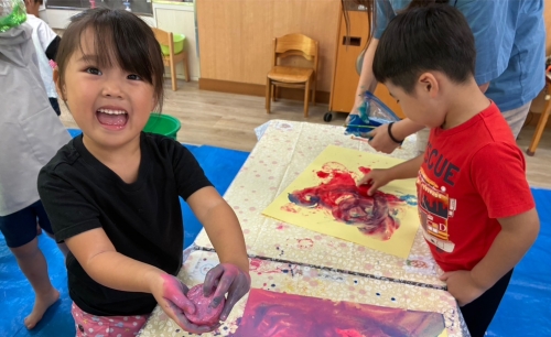 触ってみると冷たいのに色が付く不思議に興味津々でした。