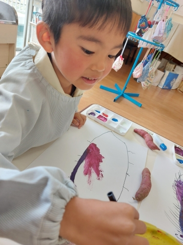 「ひげが生えてる!」「紫だけじゃなくて土の茶色もあるね」「こんな色かな?」と作った絵の具とお芋を見比べながら描き上げていました🍠