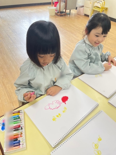 お遊戯会のイメージを膨らませるために行った自由画帳に絵を描く活動では、セリフを口ずさみながらそれぞれ個性のある作品が出来ました!