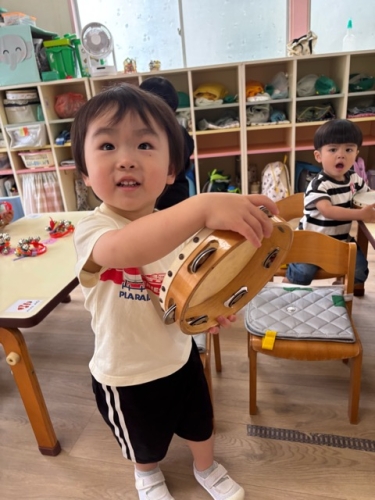 楽器遊びをした時には、最後はタンバリンをハンドルに見立てて「バスにのって」の曲をかけたら、とっても喜んでいました!