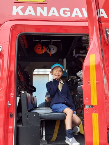 消防車では、中に座らせてもらい、緊張している様子のお友達もいました💗