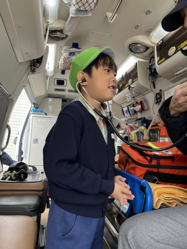 聴診器で、消防士さんの心臓の音を聞かせてもらい…