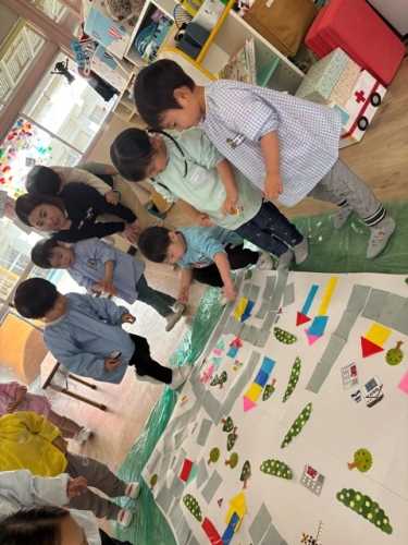 プラレールの線路を繋げて遊ぶのが上手な子がたくさんいる事もあり、なかなか味のある道路が出来ました!