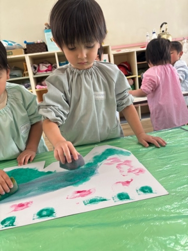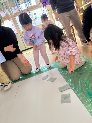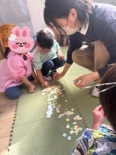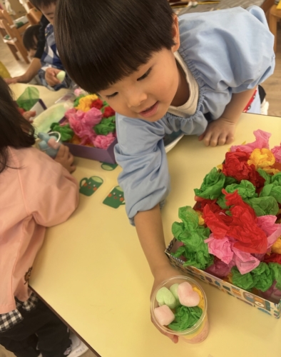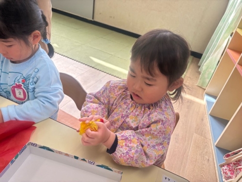 パプリカクラスは、おままごとで遊べるようになっていて、色々な味に見立て、花紙を丸める工程を子ども達にはやってもらいました!