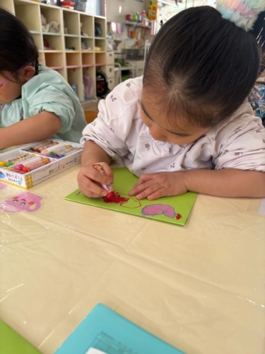 「家」の壁面の上にはクレヨンでおえかきしたものも飾ってあります!たくさんの色を使っている子もいれば、好きな色を厳選している子もいてこちらも個性が出ていてかわいいです☆ぜひ一つひとつを見に来てくださいね