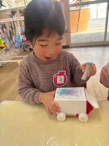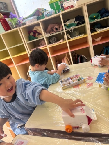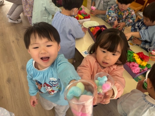 今年度のプレクラスは、1年間を通してずっと大好きで遊びの中心だった「おままごと」や「のりもの」を作り、当日遊べるように取り組んできました!製作をするのも好きになって、ハサミやのり、クレヨン、絵の具に花紙、紙粘土…たくさんの素材に触れる機会にもなりました♪プレイタイムの活動は合同で行っていたので、一緒に過ごした時間はとっっってもにぎやかでした!