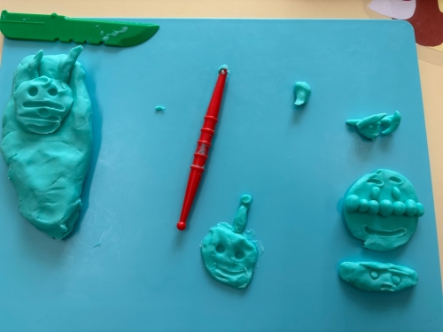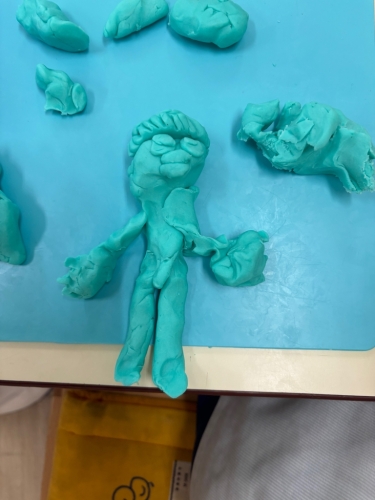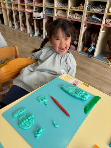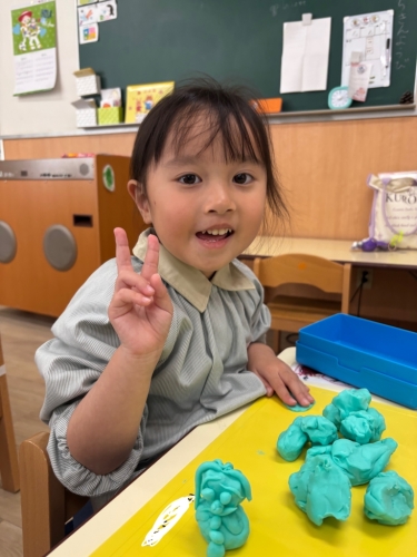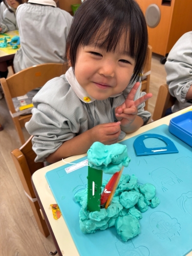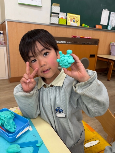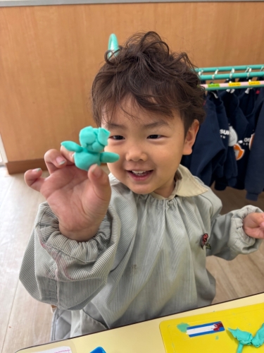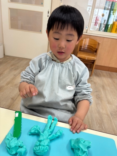 ↑担任がアンパンマンを作ると「その仲間たち」をたくさん作りました。「ほかに何がいる?」とまだまだ作り足りないようでしたが、「もう粘土ないよ」と自分の粘土が尽きてしまった様でした😊残った小さな粘土で皆にご飯をあげていました。